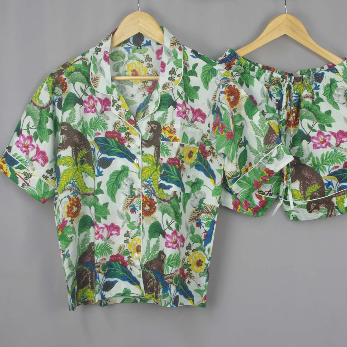 Short Cotton PJ Set With Pouch - White Tropical Monkeys