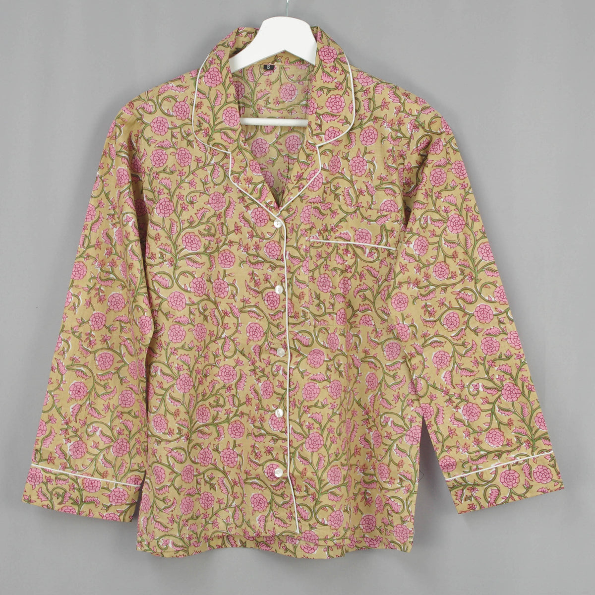 Es ist an der Zeit, Ihren flauschigen Schlafanzug gegen ein Pyjama-Set aus weicher und atmungsaktiver Baumwolle mit Blockdruck einzutauschen. Unser Sortiment umfasst klassische Hemdoberteile und komplette Unterteile. Erhältlich in 3 Größen. Jedes Design wurde von unseren erfahrenen Handwerkern in Jaipur, Indien, unter Verwendung von Handwerkstechniken wie Handblockdruck entwickelt.