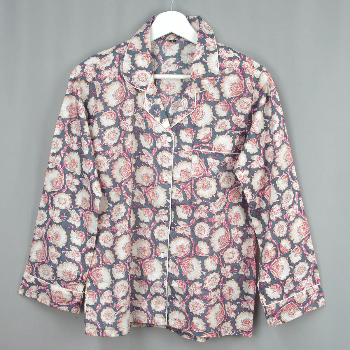 Langes bläulich-graues Pyjama-Set mit rosafarbenem Blumen-Blockdruck-Design